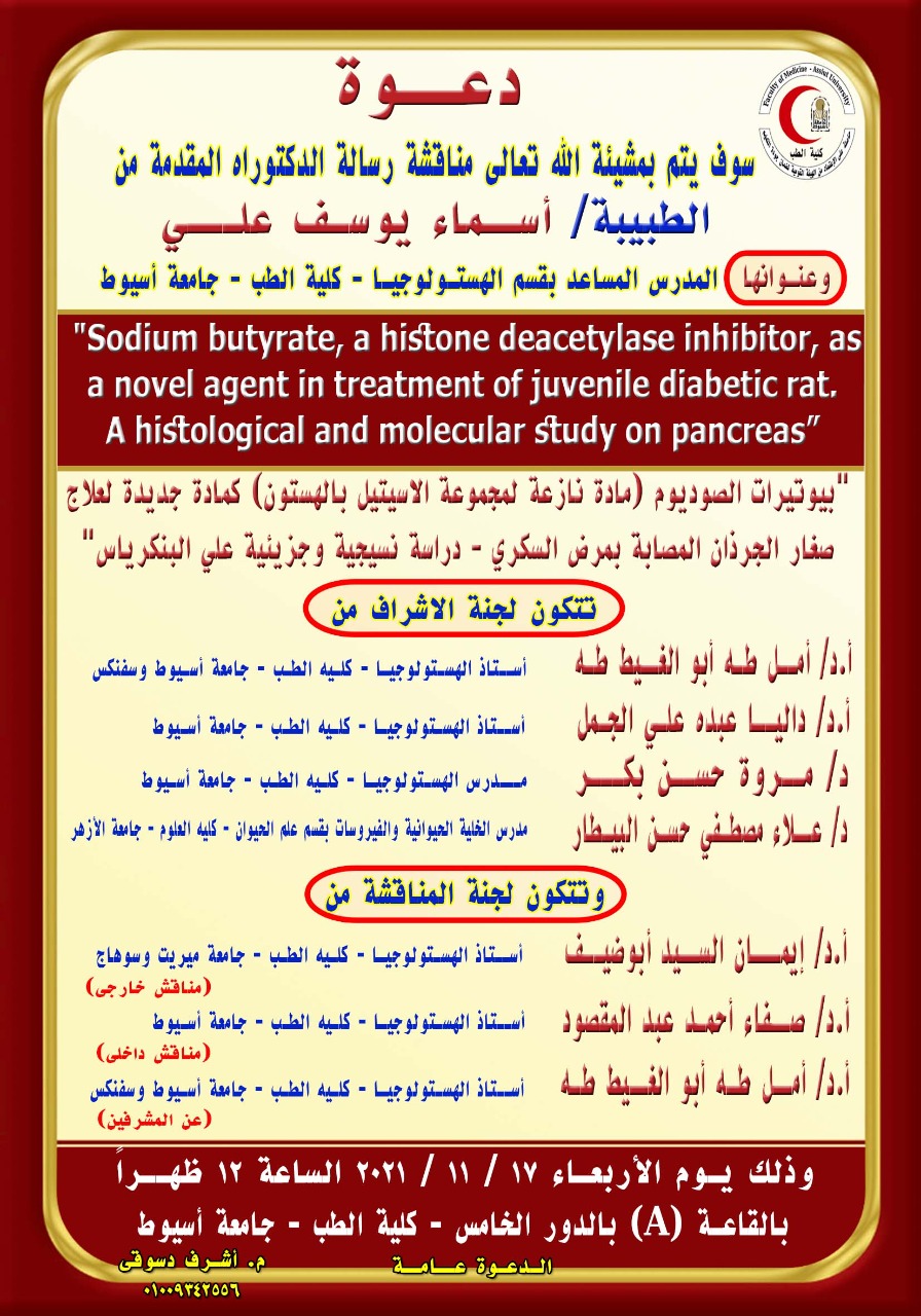 دعوة لحضور مناقشة رسالة الدكتوراة المقدمة من الطبيبة / أسماء يوسف على - قسم الهستولوجى ، وذلك يوم الأربعاء الموافق 17 نوفمبر 2021 م ، الساعة 12 ظهراً بقاعه A - بالدور الخامس - بمبنى كلية الطب .