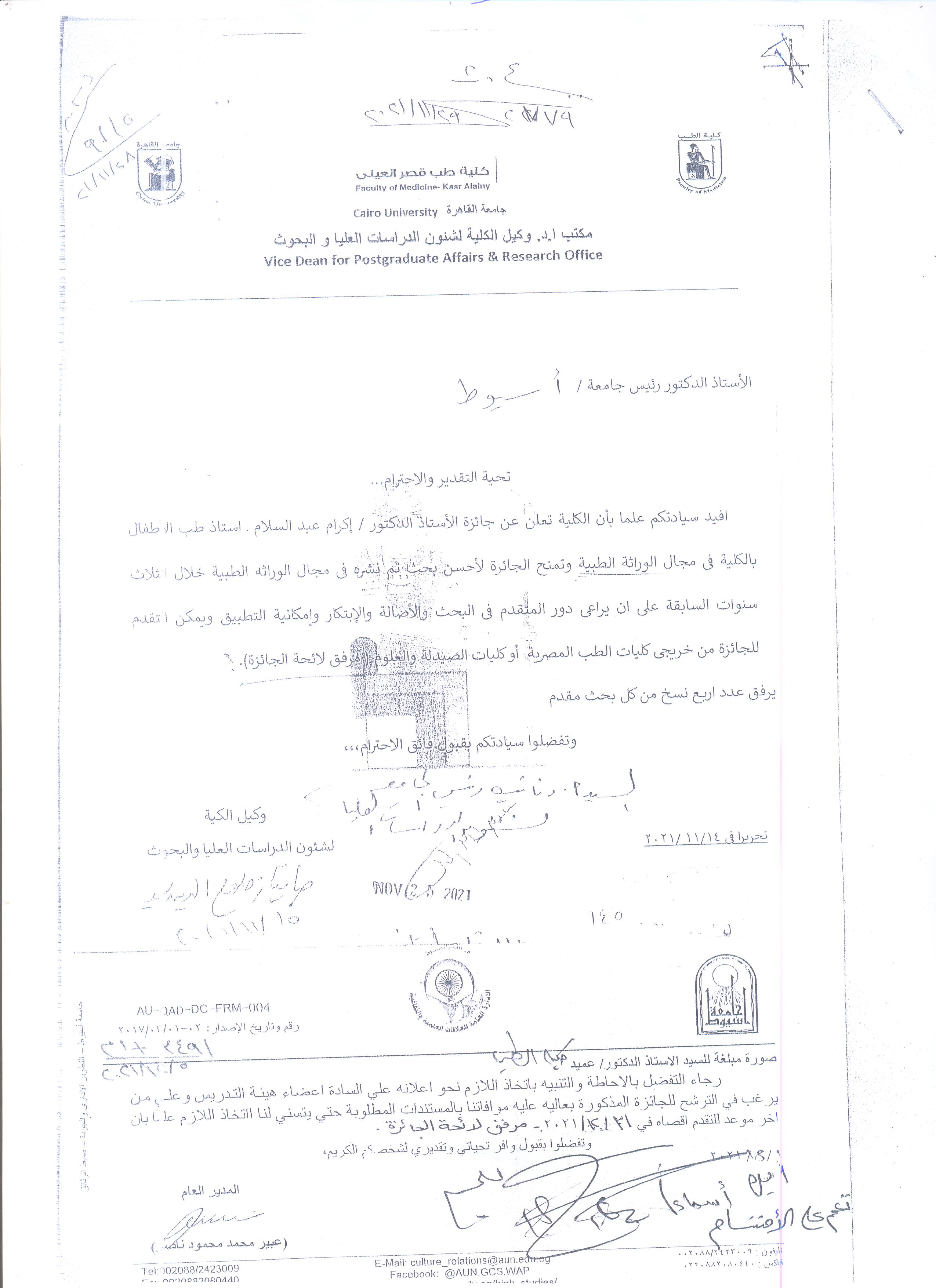جائزة الأستاذ الدكتور / إكرام عبد السلام فى مجال الوراثة الطبية