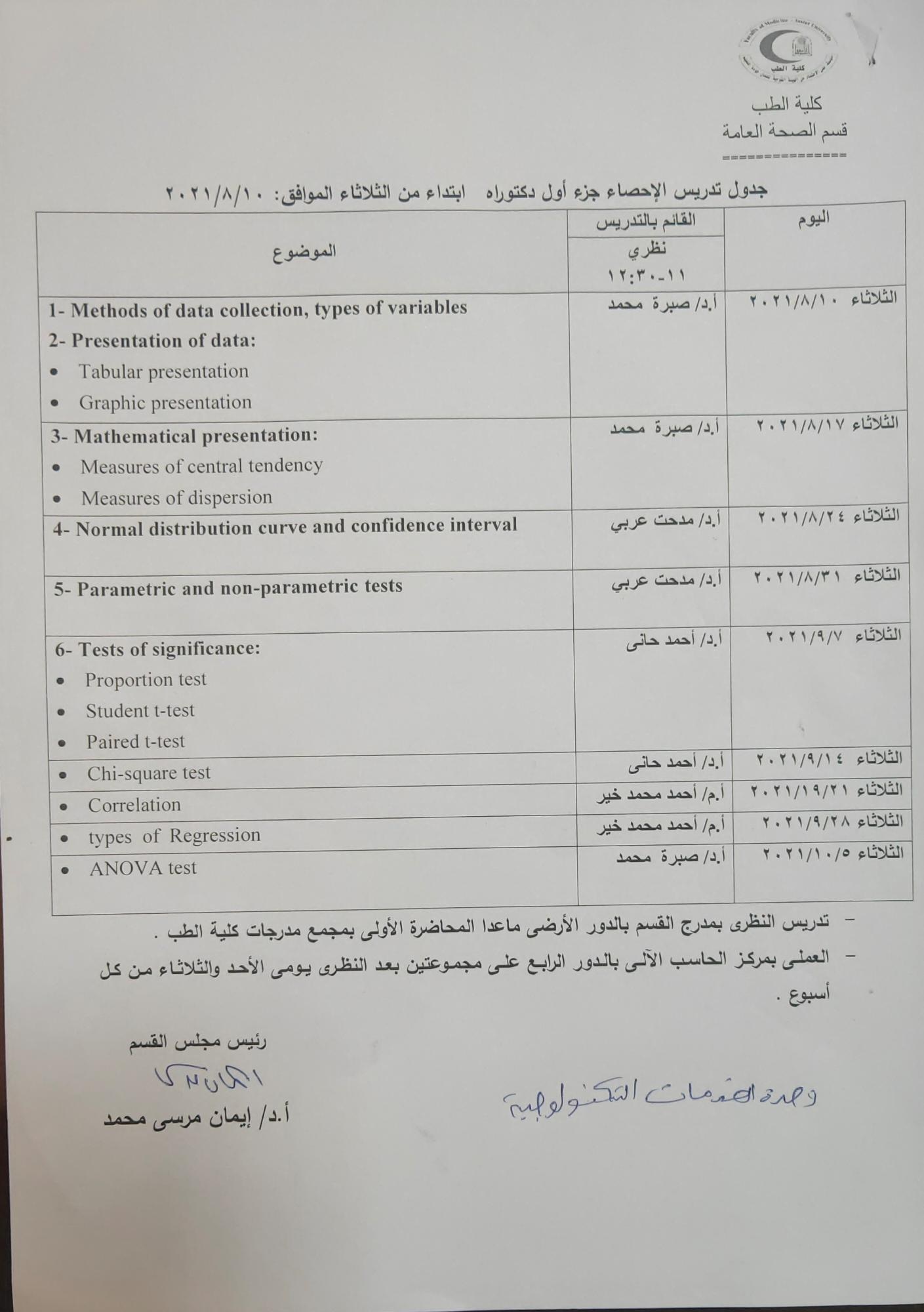 جدول تدريس الإحصاء جزء أول دكتوراة - قسم الصحه العامة 2 أغسطس 2021 جدول تدريس الإحصاء جزء أول دكتوراة - قسم الصحه العامة