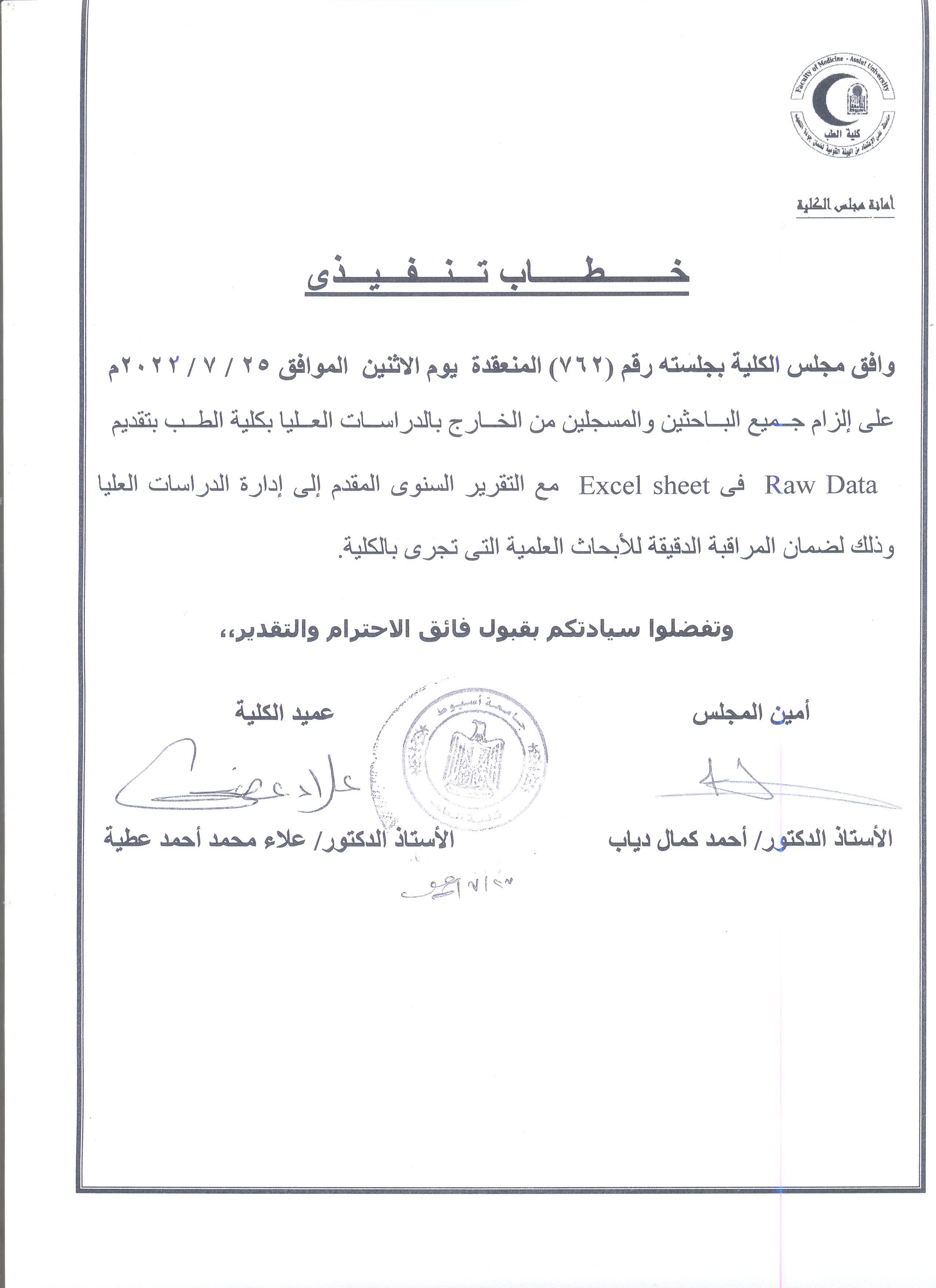 مع التقرير السنوى Excel sheetفى Raw Data قرار مجلس الكليه بتاريخ 25-7-2022 على الزام جميع الباحثين والمسجلين من الخارج بتقديم 25 يوليو 2022