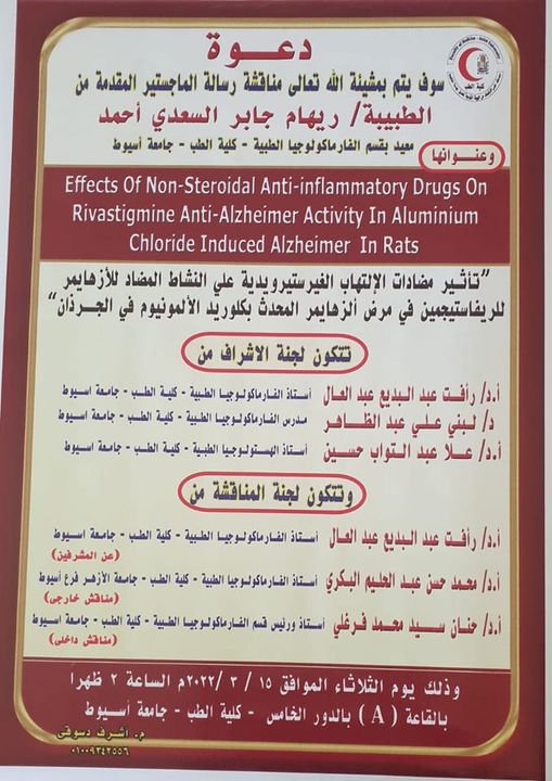 مناقشة رسالة الماجستير - المقدمة من الطبيبة / ريهام جابر السعدى - قسم الفارماكولوجى