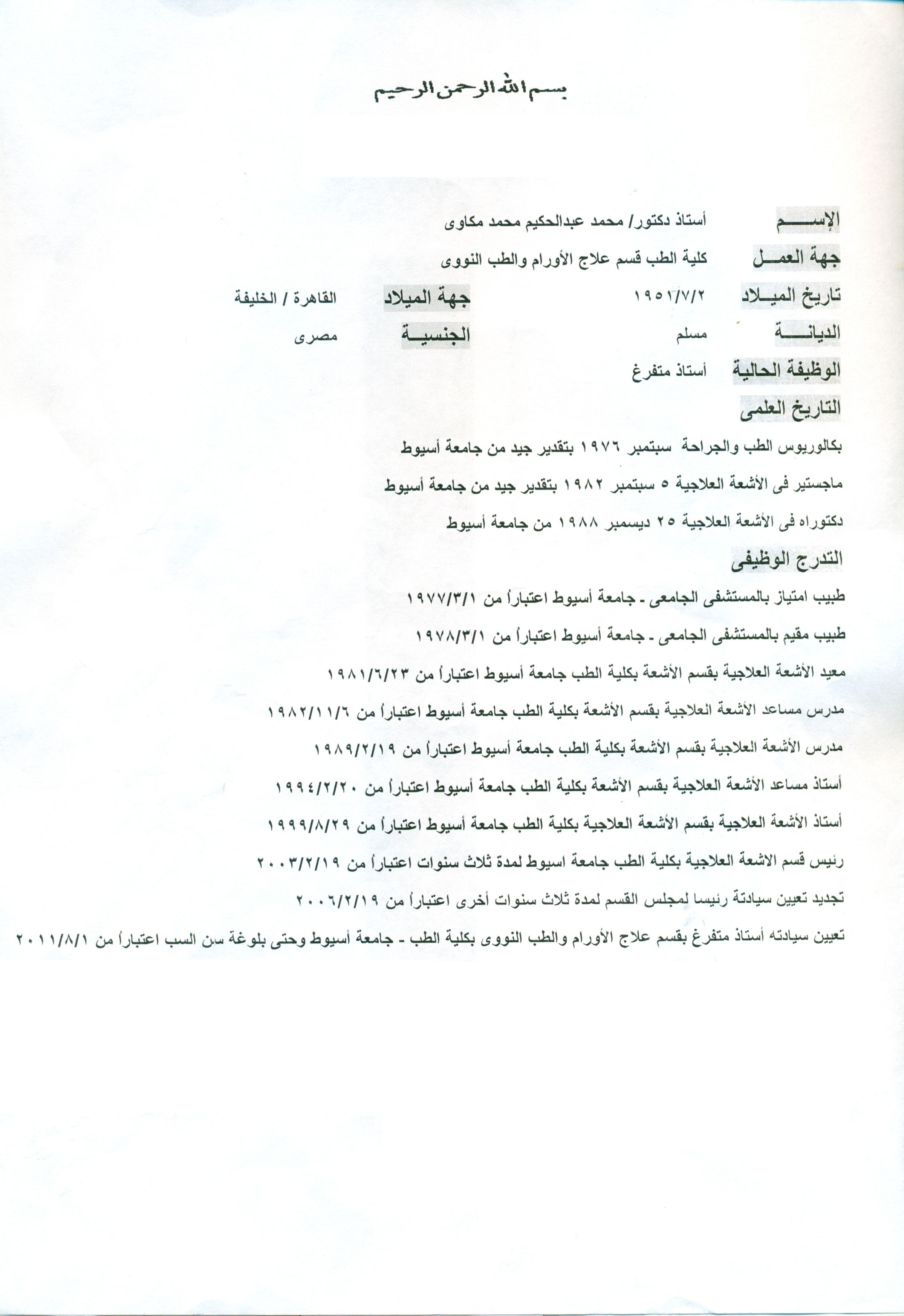 دكتوراه ﻒﻳ علاج الأورام و الطب النووي (علاج الأورام) , كلية الطب جامعة أسيوط , 1989