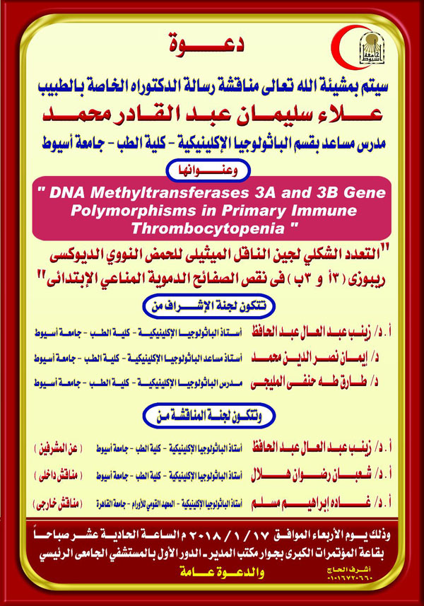 مناقشة رسالة الدكتوراه الخاصة بالطبيب/ علاء سليمان عبد القادر محمد المدرس المساعد بقسم الباثولوجيا الإكلينيكية Read more about مناقشة رسالة الدكتوراه الخاصة بالطبيب/ علاء سليمان عبد القادر محمد المدرس المساعد بقسم الباثولوجيا الإكلينيكية مناقشة رسالة الدكتوراه الخاصة بالطبيب/ علاء سليمان عبد القادر محمد المدرس المساعد بقسم الباثولوجيا الإكلينيكية تصنيف الخبر Alumni 14 يناير 2018