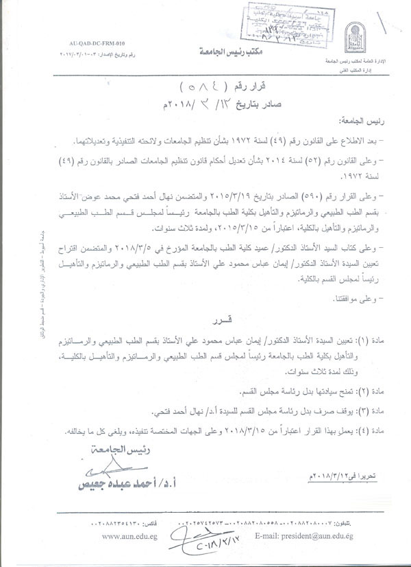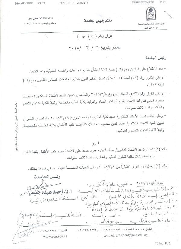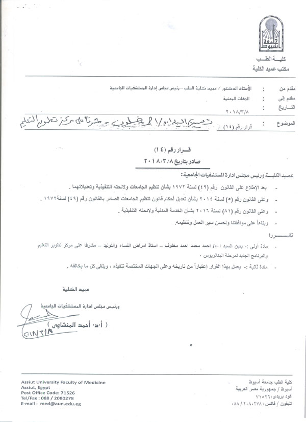 أعلن الأستاذ الدكتور أحمد المنشاوي عميد كلية الطب ورئيس مجلس إدارة مستشفيات أسيوط الجامعية