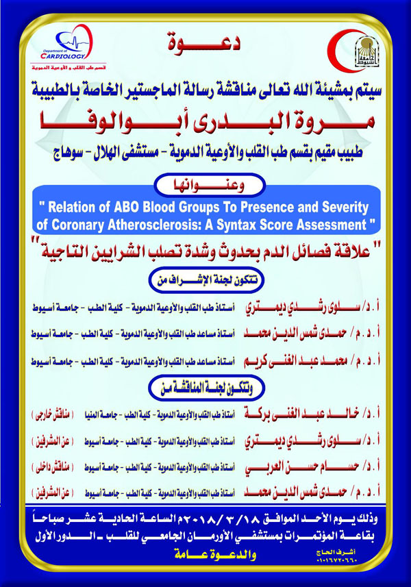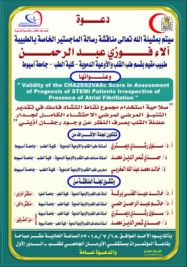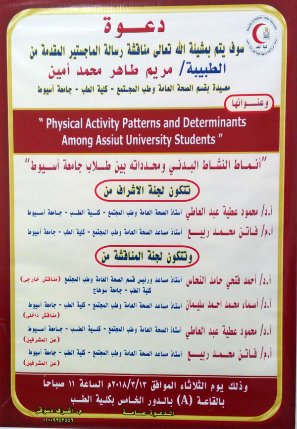 مناقشة رسالة الماجستير الخاصة بالطبيبة/ مريم طاهر محمد أمين الطبيب بقسم الصحة العامة وطب المجتمع