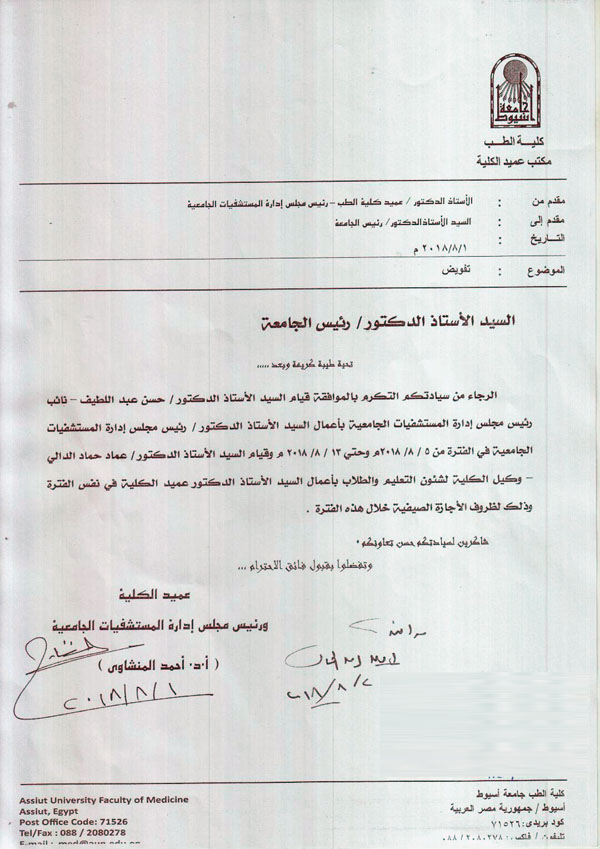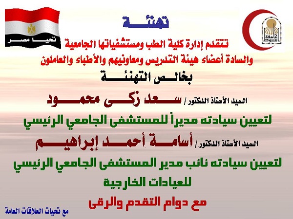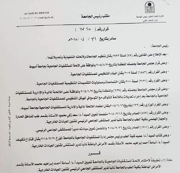 تعيين الأستاذ الدكتور/ أسامة أحمد إبراهيم محمد الأستاذ بقسم الأمراض الباطنة نائباً لمدير المستشفى الجامعي الرئيسي لشئون العيادات الخارجية