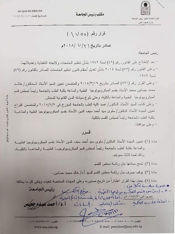 تعيين أ.د/ سلوى سيد أحمد سيف الدين الأستاذ بقسم الميكروبيولوجيا الطبية والمناعة رئيساً لمجلس القسم