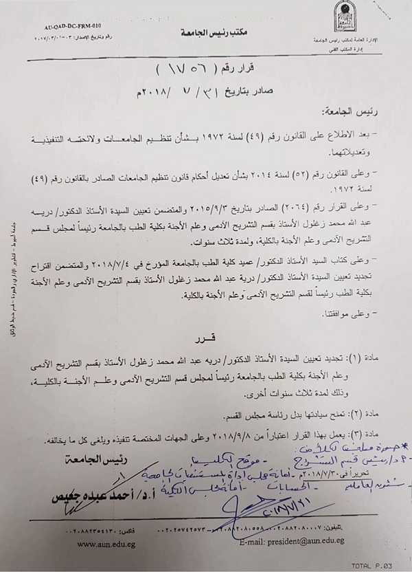 تعيين أ.د/ درية عبد الله محمد زغلول الأستاذ بقسم التشريح الآدمي وعلم الأجنة رئيساً لمجلس القسم