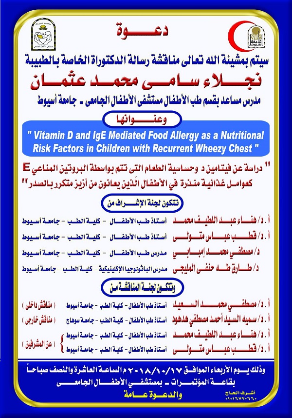 مناقشة رسالة الدكتوراه الخاصة بالطبيبة/ نجلاء سامي محمد عثمان المدرس المساعد بقسم طب الأطفال