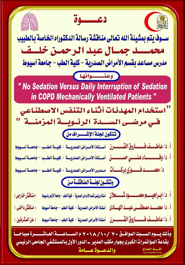 مناقشة رسالة الدكتوراه الخاصة بالطبيب/ محمد جمال عبد الرحمن خلف المدرس المساعد بقسم الأمراض الصدرية