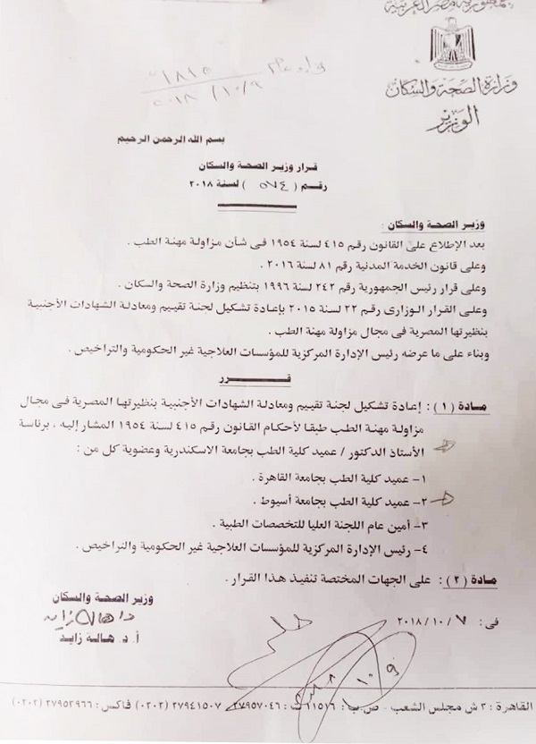 إعادة تشكيل لجنة تقييم ومعادلة الشهادات الأجنبية بنظيرتها المصرية في مجال مزاولة مهنة الطب