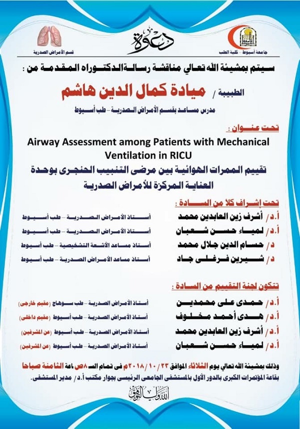 مناقشة رسالة الدكتوراه الخاصة بالطبيبة/ ميادة جمال الدين هاشم المدرس المساعد بقسم الأمراض الصدرية