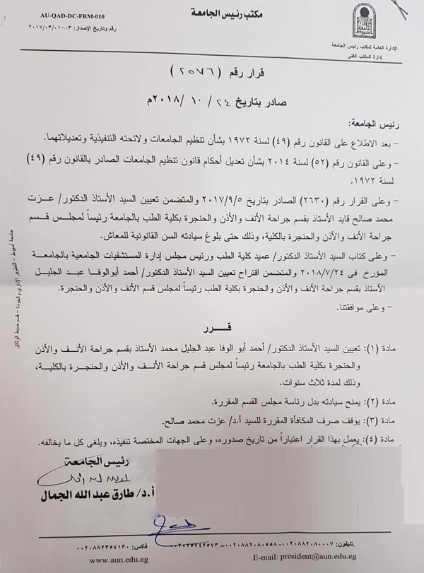 تعيين السيد الأستاذ الدكتور/ أحمد أبو الوفا عبد الجليل محمد رئيساً لقسم جراحة الأنف والأذن والحنجرة