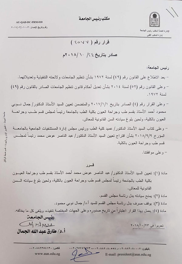 تعيين السيد الأستاذ الدكتور/ عبد الناصر عوض محمد أحمد رئيساً لقسم طب وجراحة العيون