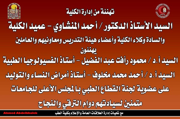 منح السيدة الدكتور/همت هريدى غفير هريدى اللقب العلمى لوظيفة أستاذ بقسم الهستولوجيا(علم الأنسجة وبيولوجيا الخلية) بكلية الطب بالجامعة