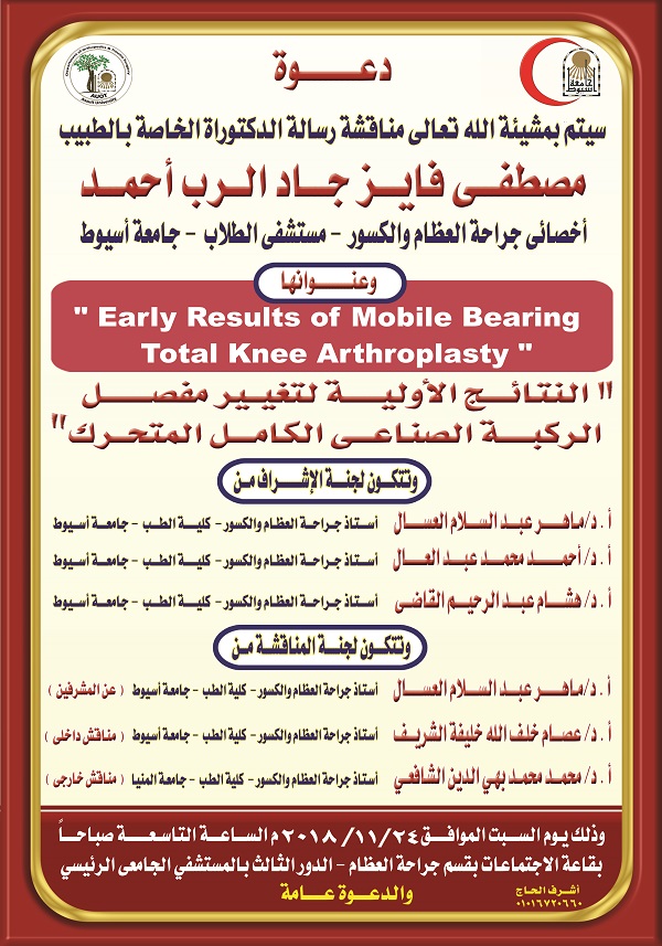 مناقشة رسالة الدكتوراه الخاصة بالطبيب/ مصطفى فايز جاد الرب أحمد المدرس المساعد بقسم جراحة العظام والكسور