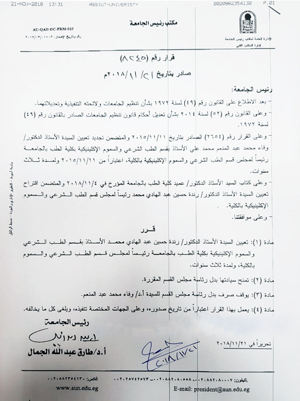 تعيين أ.د/ رندة حسين عبد الهادي محمد الأستاذ بقسم الطب الشرعي والسموم الإكلينيكية رئيساً لمجلس القسم