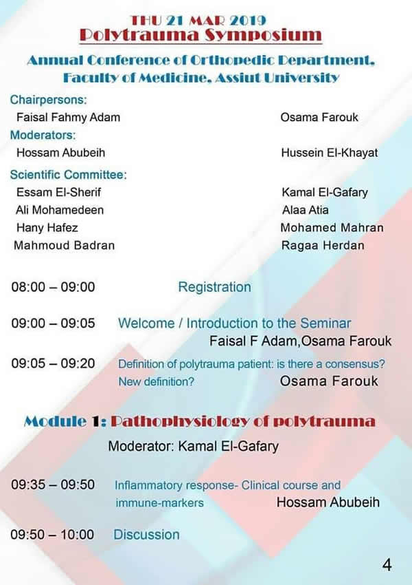 يتشرف قسم جراحة العظام بدعوة سيادتكم لحضور للورشة التدريبية للإصابات المتعددة والتي سوف يتم عقدها يوم الخميس الموافق 21 مارس 2019 بالقاعة الثمانية بالمبنى الإداري