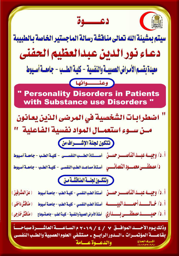 مناقشة رسالة الماجستير الخاصة بالطبيبة/ دعاء نور الدين عبد العظيم الحفني الطبيب بقسم الأمراض العصبية والنفسية