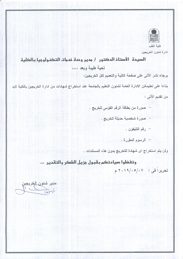 الأوراق المطلوبة لإستخراج شهادات الخريجين Read more about الأوراق المطلوبة لإستخراج شهادات الخريجين الأوراق المطلوبة لإستخراج شهادات الخريجين تصنيف الخبر Alumni 8 مايو 2019
