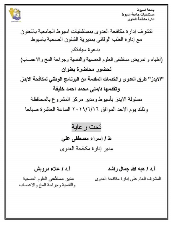 عقدت يوم الاحد ١٦/٦/٢٠١٩ فعاليات محاضره عن الايدز وكيفيه نقل العدوى والوقايه منها واجراءات التبليغ حاضر فيها د/ منى محمد خليفة - مسئول الايدز بمحافظة اسيوط وذلك فى مستشفى الامراض العصبيه والنفسيه تحت اشراف الاستاذه الدكتوره/ هبه راشد المشرف - العام على وحده مكافحه العدوى ود/ اسراء مصطفى - مدير اداره مكافحه العدوى ود/ علاء درويش - مدير مستشفى العصبيه والنفسيه كانت الحضور من الاطباء والتمريض والعمال وتم عمل اختبار سريع للايدز للعاملين بالمستشفى من اطباء وتمريض وبمزيد من النجاح للاداره ان شاء الله