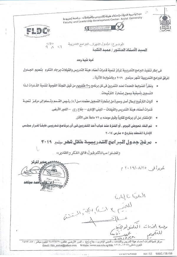 جدول البرامج التدريبية لمركز تنمية قدرات أعضاء هيئة التدريس والقيادات لشهر سبتمبر 2019