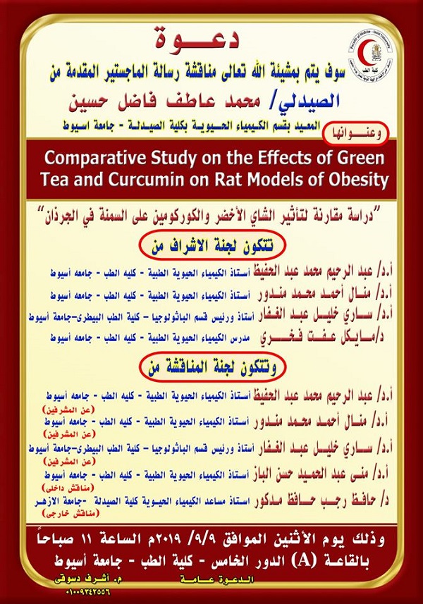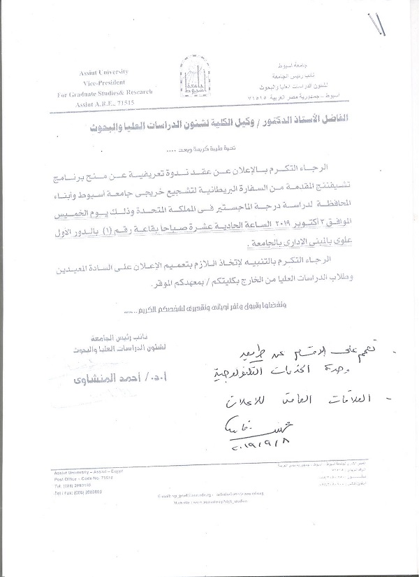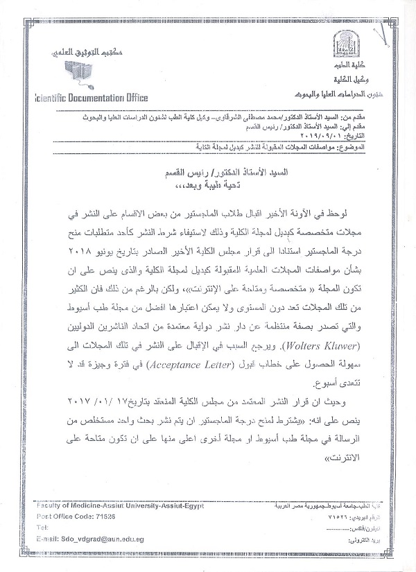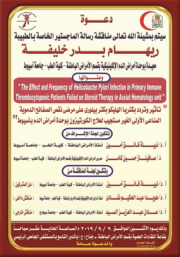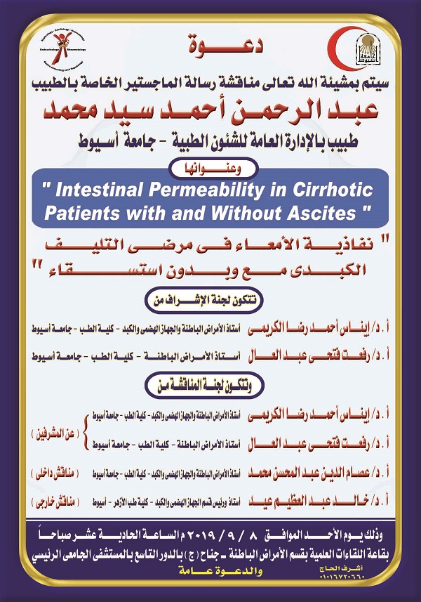 تقرر بدء الدورة التخصصية المهنية للموجات فوق الصوتية على الصدر التى ينظمها قسم الامراض الصدرية بكلية طب اسيوط للمرة الثانية خلال العام الجارى علي ان تبدأ يوم ٦ سبتمبر ٢٠١٩ ومدة الدورة ٣ أشهر يومى الجمعة والسبت من كل أسبوع وقيمة الاشتراك 5 آلاف جنيه ويمنح المشترك شهادة معتمدة من كلية طب اسيوط وجامعة أسيوط يتم دفع الاشتراك في أول أيام الحضور بخزينة كلية الطب بجامعة أسيوط على أن يتسلم المشترك ايصالا بالمبلغ يحتفظ به لحين حصوله على الشهادة المعتمدة ويتم تسجيل الاسماء بسكرتارية قسم الامراض الصدرية بالمستشفى .