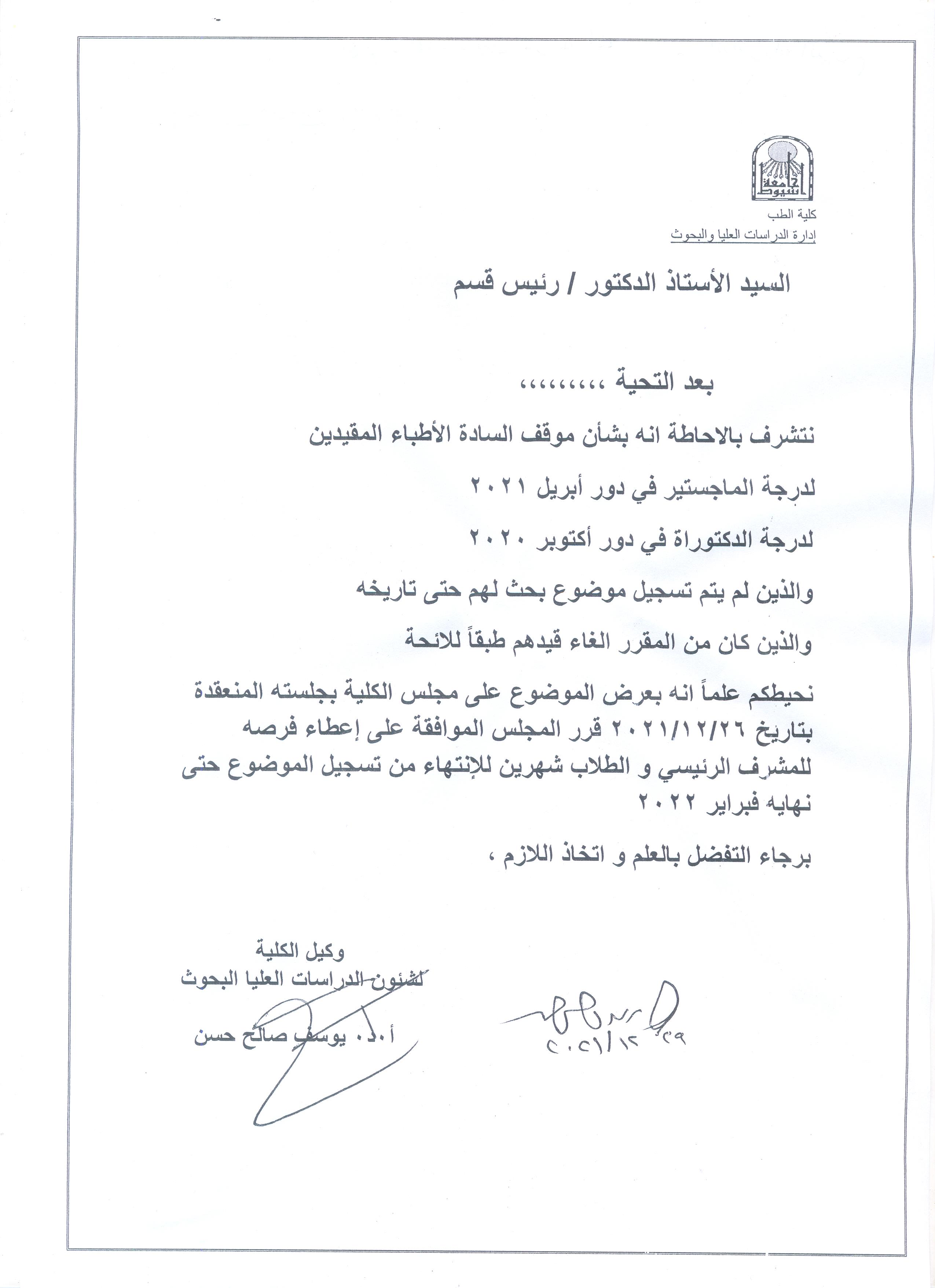 قرار بشأن السادة الأطباء المقيدين لدرجة الماجستير والدكتوراة الذين لم يتم تسجيل موضوع بحث لهم حتى تاريخه 5 يناير 2022