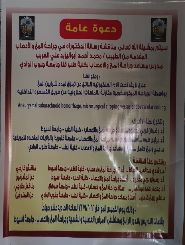 سيمينار الطبيب / محمد أحمد أبو اليزيد على - المدرس المساعد بقسم جراحة المخ والاعصاب - كلية طب قنا - جامعة جنوب الوادى 20 سبتمبر 2022