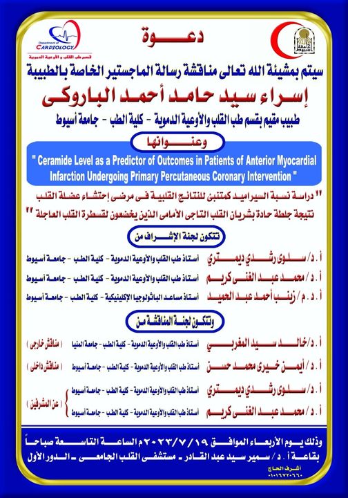 سيمينار الطبيبة / إسراء سيد حامد الباروكى- طبيب مقيم بقسم طب القلب والأوعية الموية - كلية الطب - جامعة أسيوط 18 يوليو 2023