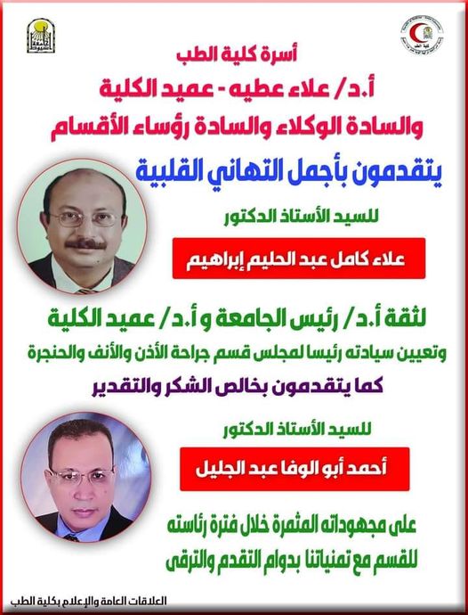 تهنئة للسيد الأستاذ الدكتور / علاء كامل عبد الحليم إبراهيم