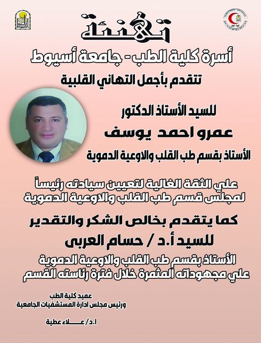 Congratulations to Prof. Dr. / Amr Ahmed Youssef - for his appointment as Chairman of the Board of the Department of Cardiovascular Medicine 6 December 2022