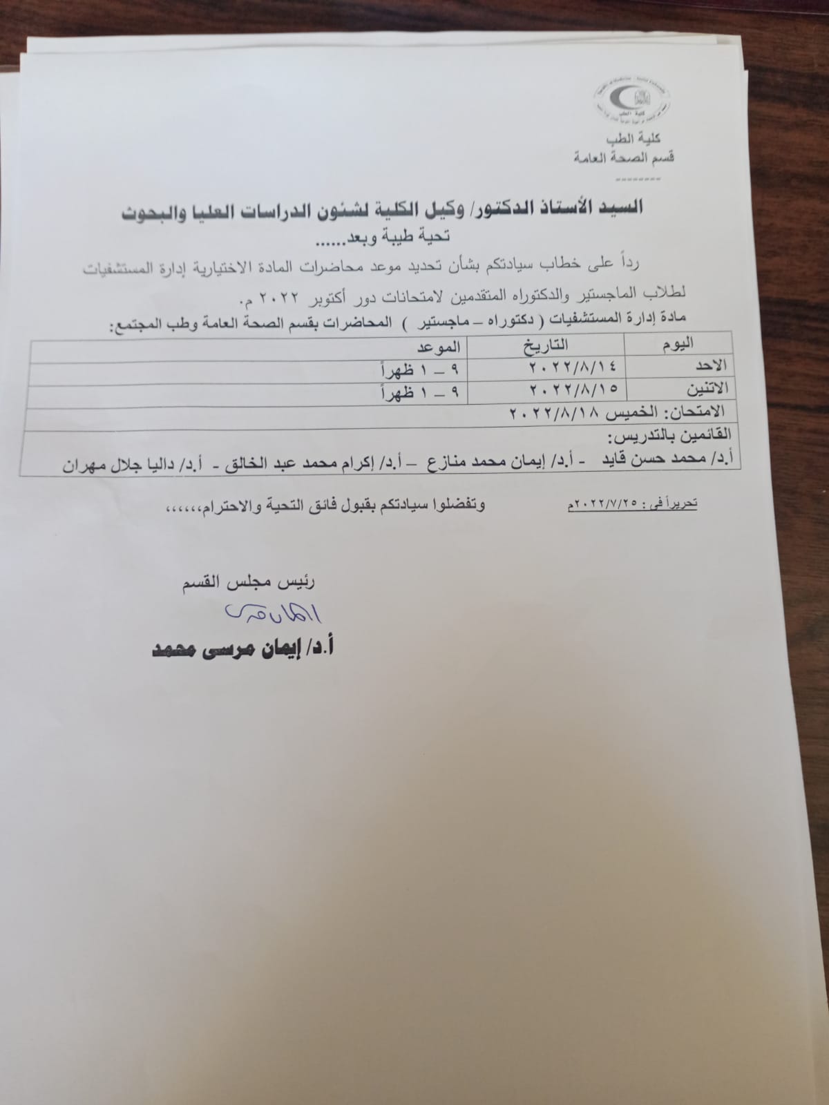 Postgraduate exams schedule