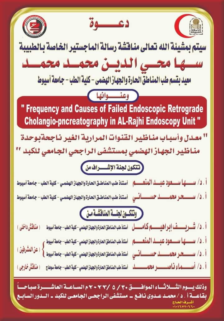 Discussion of the master's thesis of Dr. Suha Mohy El-Din Mohamed - Teaching Assistant, Department of Tropical Medicine and Gastroenterology 29 May 2023
