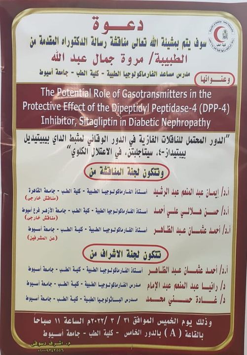Invitation to attend the doctoral thesis discussion - Dr. Marwa Gamal Abdullah - Department of Pharmacology 28 March 2022