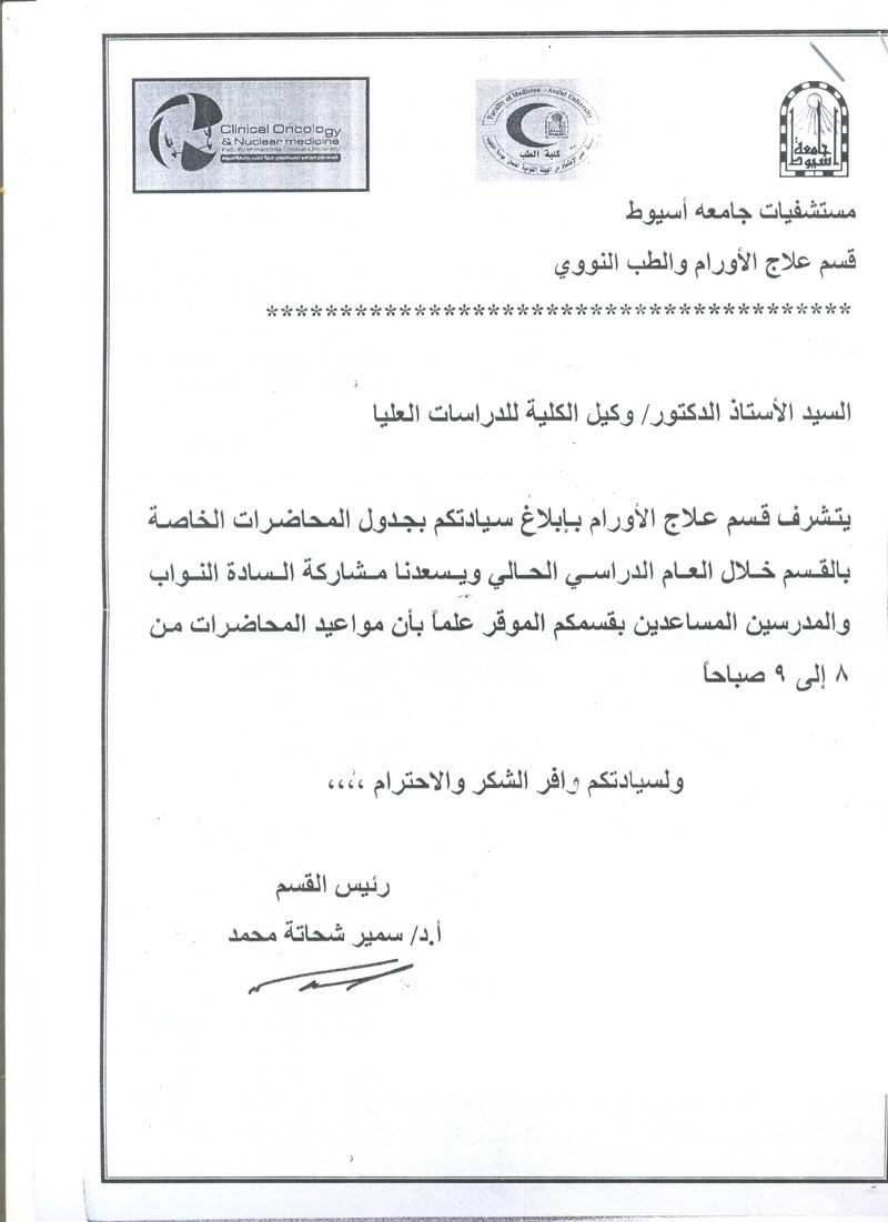 Lectures Timetable of Medical Oncology Department 27 November 2014 جدول محاضرات قسم علاج الأورام والطب النووي