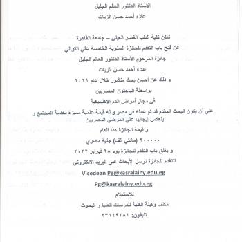 Prof. Dr. Alaa Ahmed Hassan Al-Zayat, Professor of Internal Medicine, in the field of Hematology, for the best research published during the year 2021-