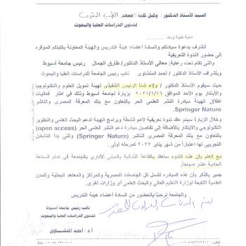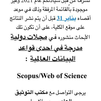 الأفاضل أعضاء هيئه التدريس الرجاء التوجه الي مكتب التوثيق العلمي - التابع لمكتب وكيل الكليه للدراسات العليا للتأكد من أبحاثكم المنشورة دولياً هذا العام ، أو التواصل من خلال الإيميل :…