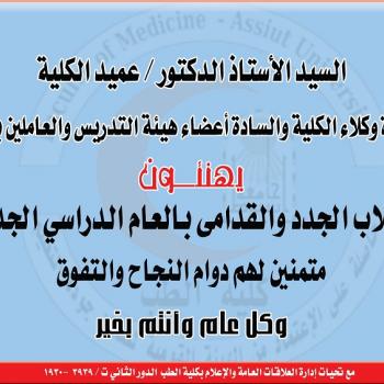 ينعى الأستاذ الدكتور/ علاء عطية - عميد الكلية والسادة الوكلاء وأعضاء هيئة التدريس ومعاونيهم والعاملين  بخالص الحزن والأسى الأستاذة الدكتورة/ مارسيل نسيم - الاستاذة بقسم الباثولوجي وأحد…