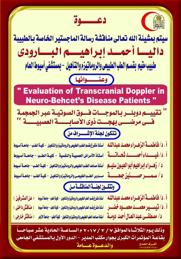 Ph.D. Master of doctor Dalia Ahmed Ibrahim Elbarody the doctor of Department of Physical Medicine, Rheumatology & Rehabilition Department 5 March 2017 Ph.D. Master of doctor Dalia Ahmed Ibrahim Elbarody the doctor of Department of Physical Medicine, Rheumatology & Rehabilition Department