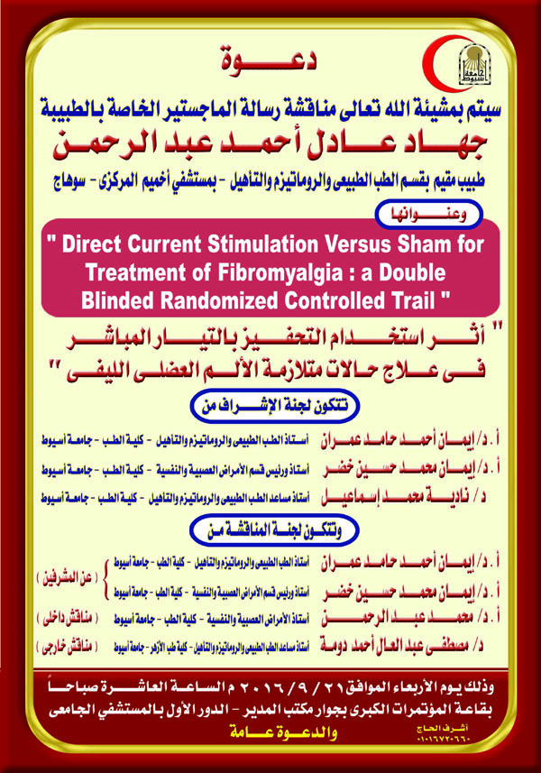 Ph.D. Master of doctor Gehad Adel Ahmed Abdel-Rahman the doctor of Physical Medicine, Rheumatology Department 19 September 2016 Ph.D. Master of doctor Gehad Adel Ahmed Abdel-Rahman the doctor of Physical Medicine, Rheumatology Department