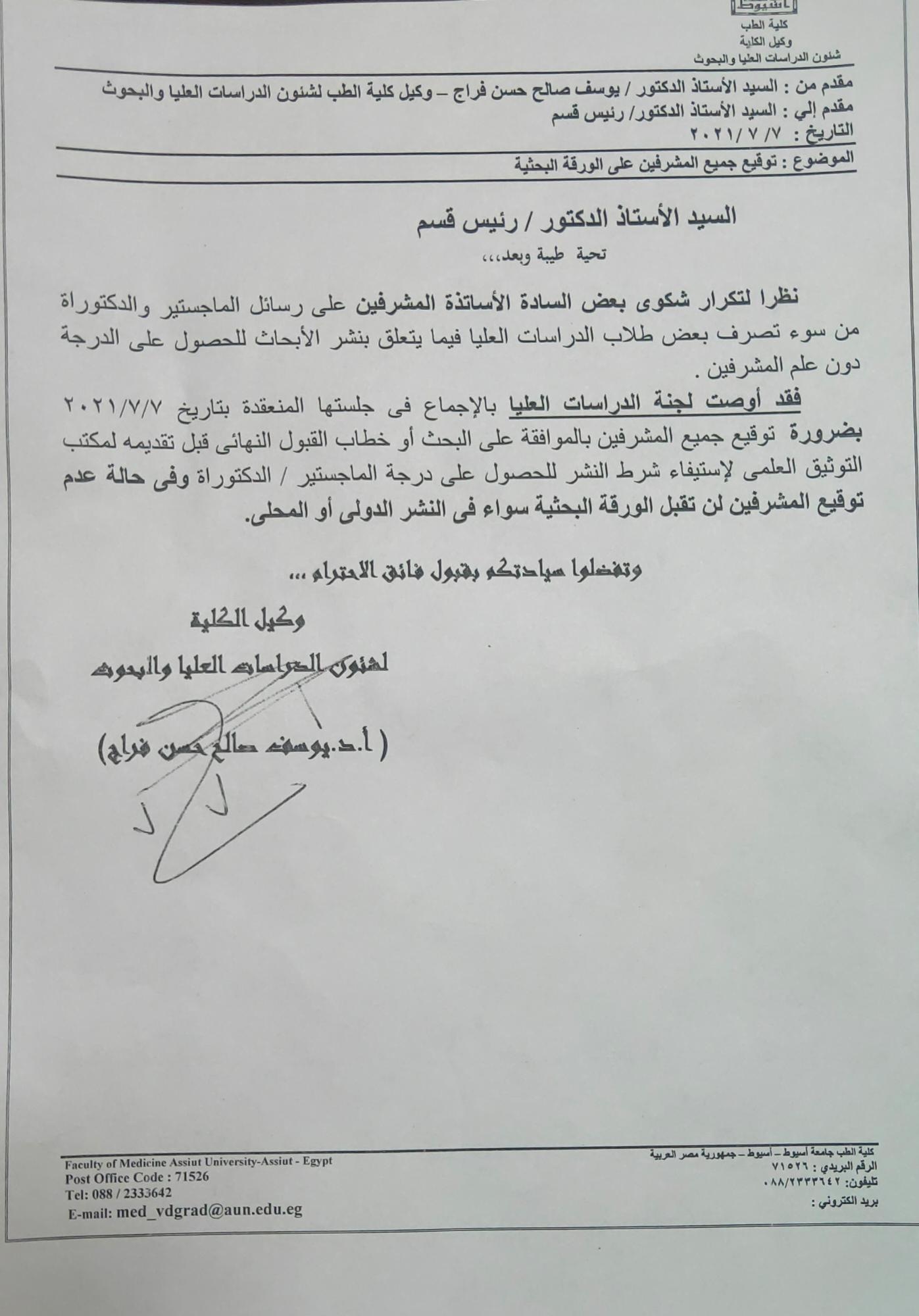 - أوصت بجنة الدراسات العليا بالإجماع فى جلستها المنعقدة بتاريخ 7/7/2021 بضرورة توقيع جميع المشرفين على البحث أو خطاب القبول النهائى قبل تقديمة لمكتب التوثيق العلمى لإستيفاء شرط النشر للحصول على درجة الماجستير / الدكتوراة وفى حالة عدم توقيع المشرفين لن تقبل الورقة البحثية سواء فى النشر الدولى أو المحلى .