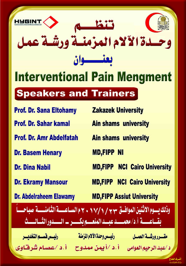 The Department of Anesthesia, Intensive Care, and Pain Management at Assiut University organizes the 13th workshop on therapeutic interventions for pain.