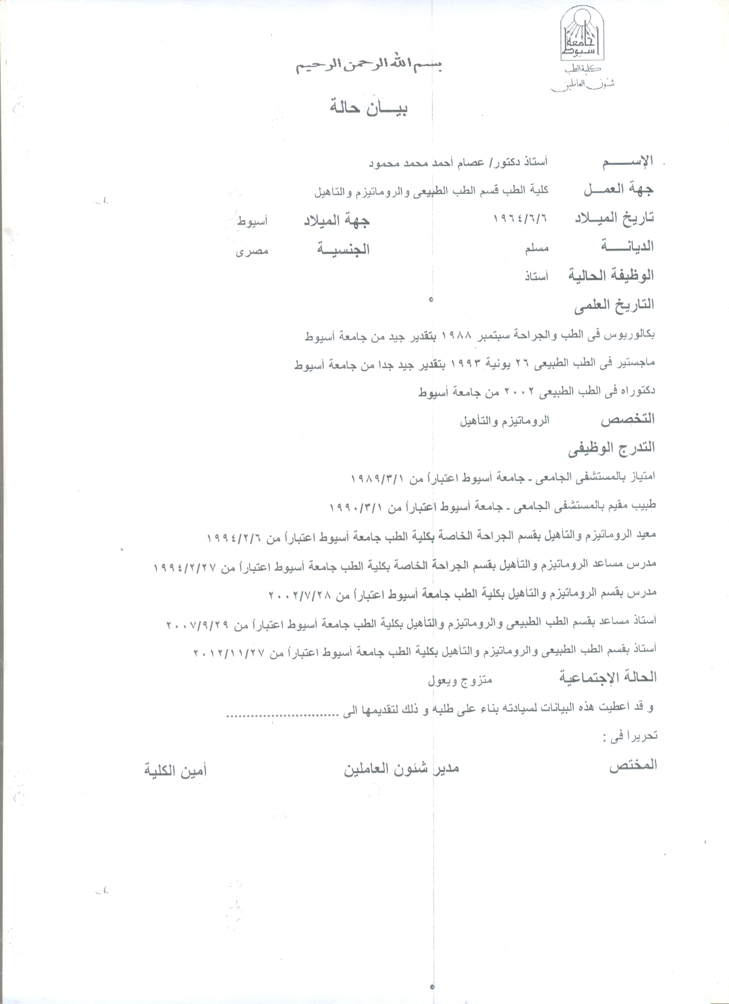 Assistant Lecturer Faculty of Medicine, Assiut University , 1994