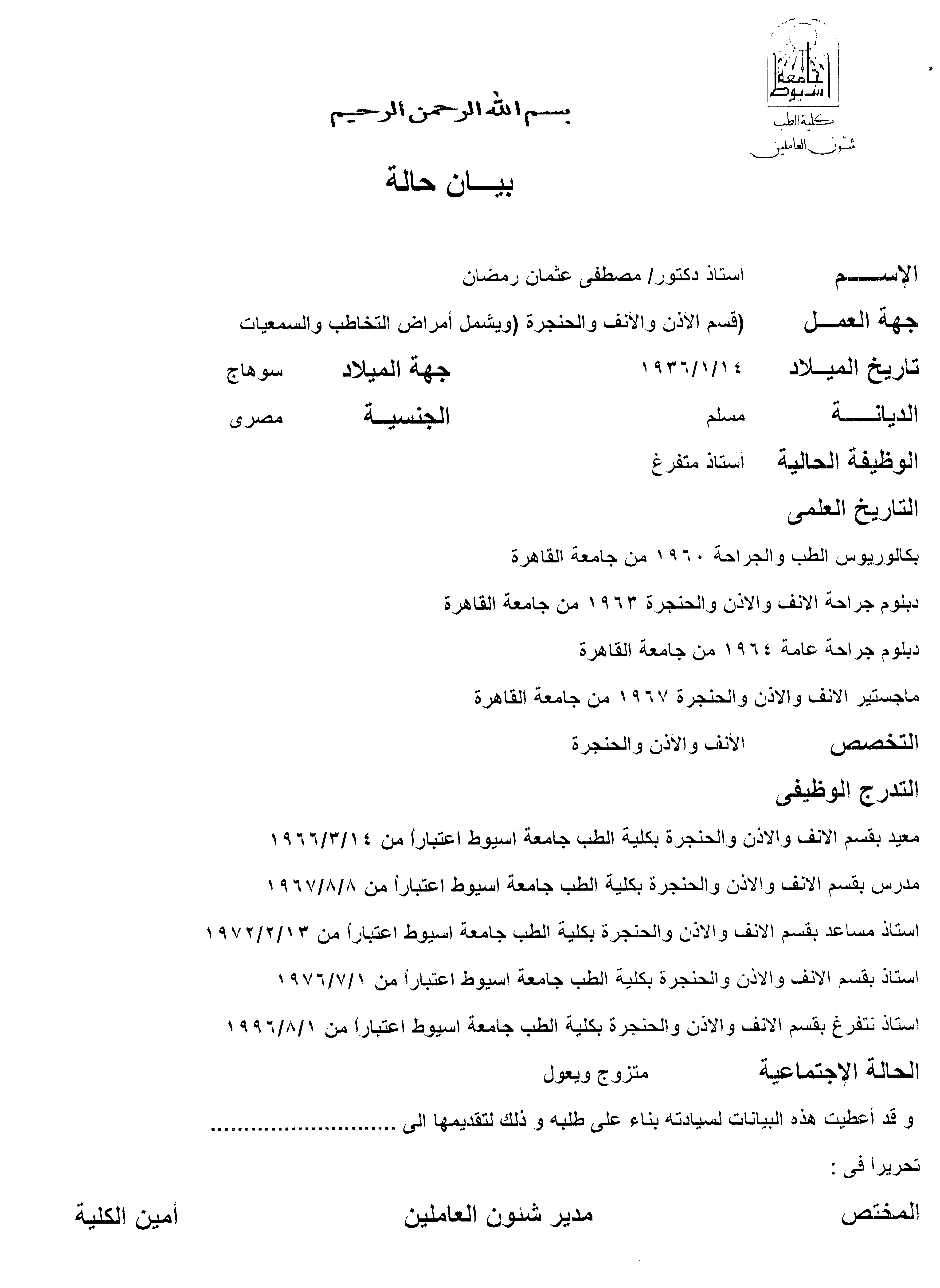 Lecturer Faculty of Medicine, Assiut University , 1967