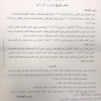 Appointment of Prof. Omyma Galal Ahmed Moaty as Chairman of Physiology Department