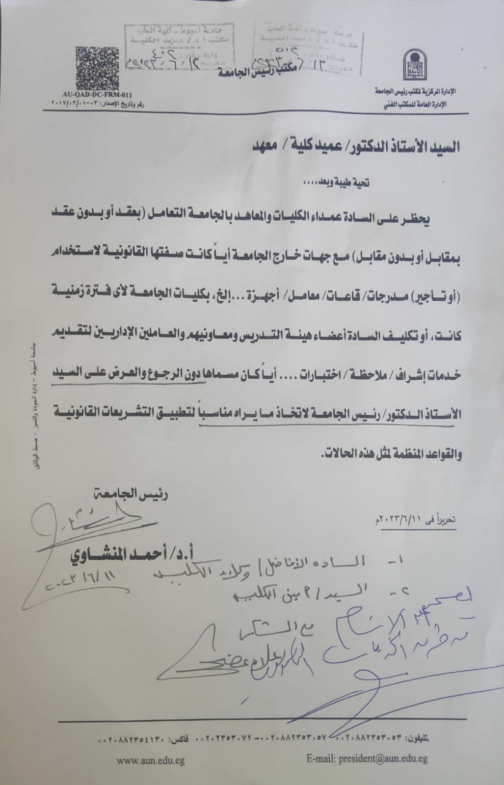 A warning regarding the prohibition of dealing with external parties except after consulting with Mr. Prof. Dr. / President of the University 15 June 2023