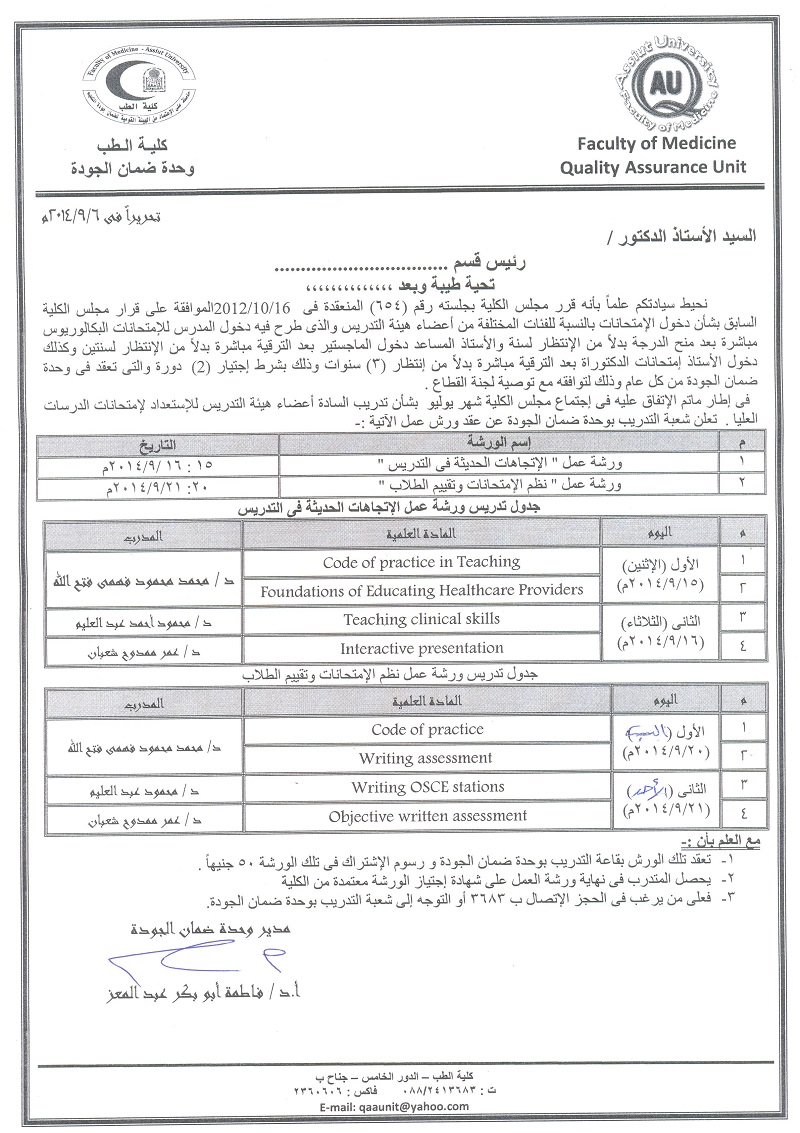 Workshops on the training of faculty members to prepare for exams graduate 6 September 2014 Workshops on the training of faculty members to prepare for exams graduate