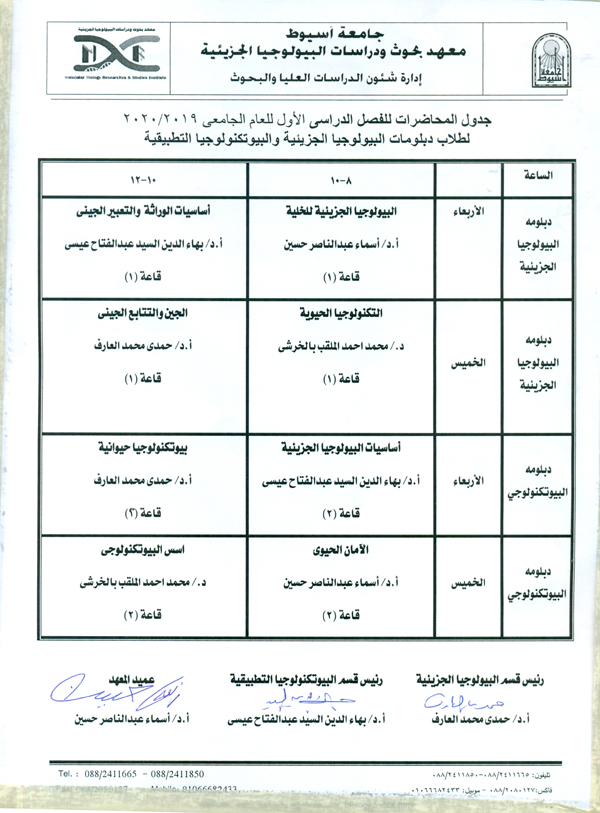 جدول محاضرات طلاب دبلومات البيولوجيا الجزيئية والبيوتكنولوجيا التطبيقية 20 يناير 2020 جدول محاضرات طلاب دبلومات البيولوجيا الجزيئية والبيوتكنولوجيا التطبيقية