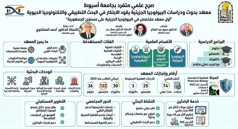 يُعد معهد بحوث ودراسات البيولوجيا الجزيئية بجامعة أسيوط أحد النماذج الرائدة والمتخصصة على مستوى الجمهورية، لما يتميز به من خصوصية علمية تجمع بين التخصصات المختلفة في إطار تكاملي يدعم البحث البيني، ويواكب التطورات المتسارعة في مجالات البيولوجيا الجزيئية والتقنيات الحيوية الحديثة، بما يسهم في إعداد كوادر علمية مؤهلة قادرة على الابتكار والمنافسة.